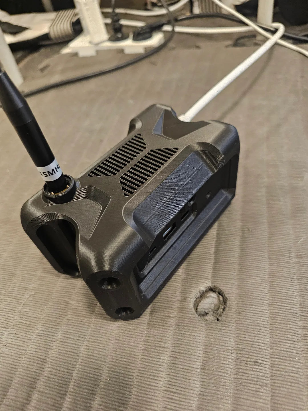 A fully enclosed Haven node in its 3D-printed armor — ventilated ridges across the top, antenna tuned for 915 MHz.