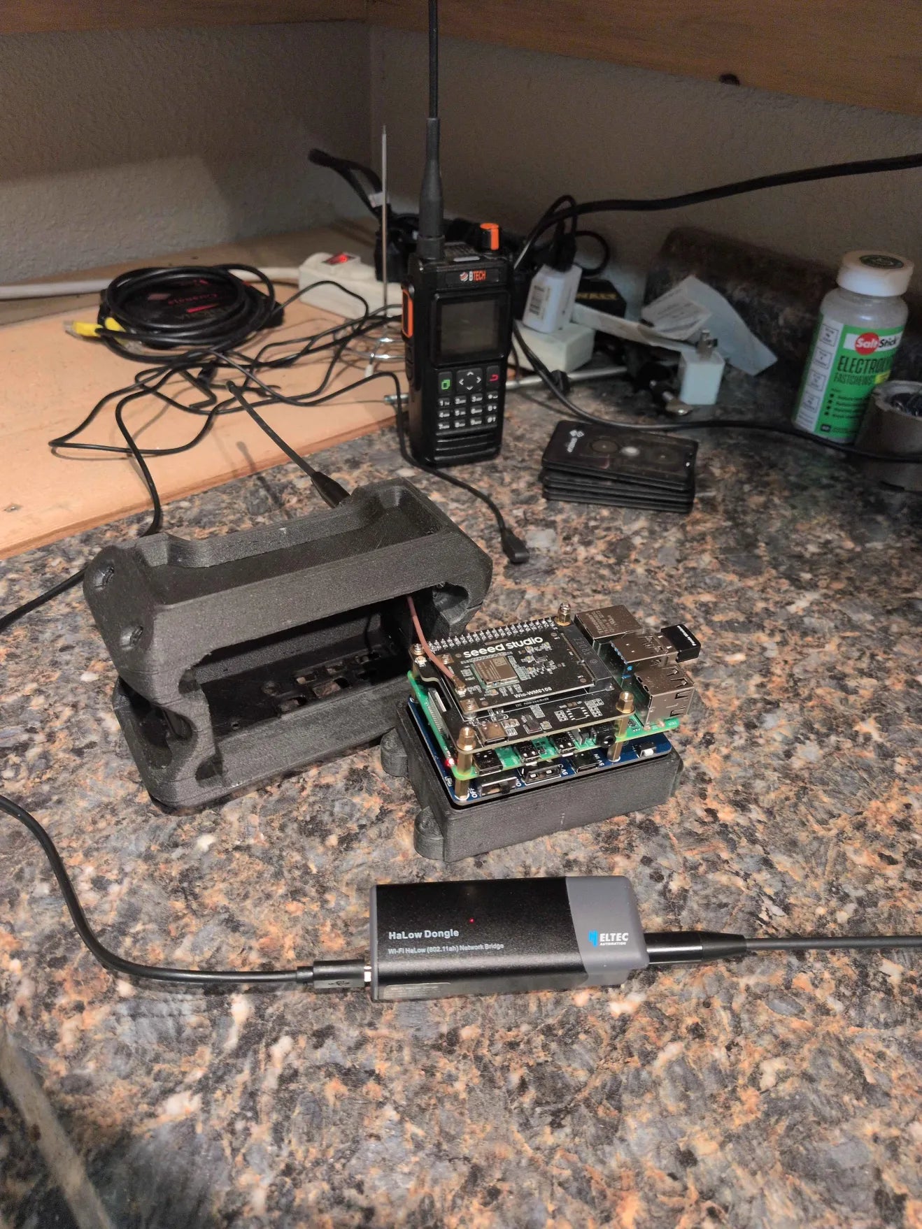 A Raspberry Pi-based Haven node sits mid-setup next to its 3D-printed enclosure, tethered to a Heltec HaLow USB dongle — a DIY bridge linking the sub-GHz mesh to a waiting handheld radio on the bench.